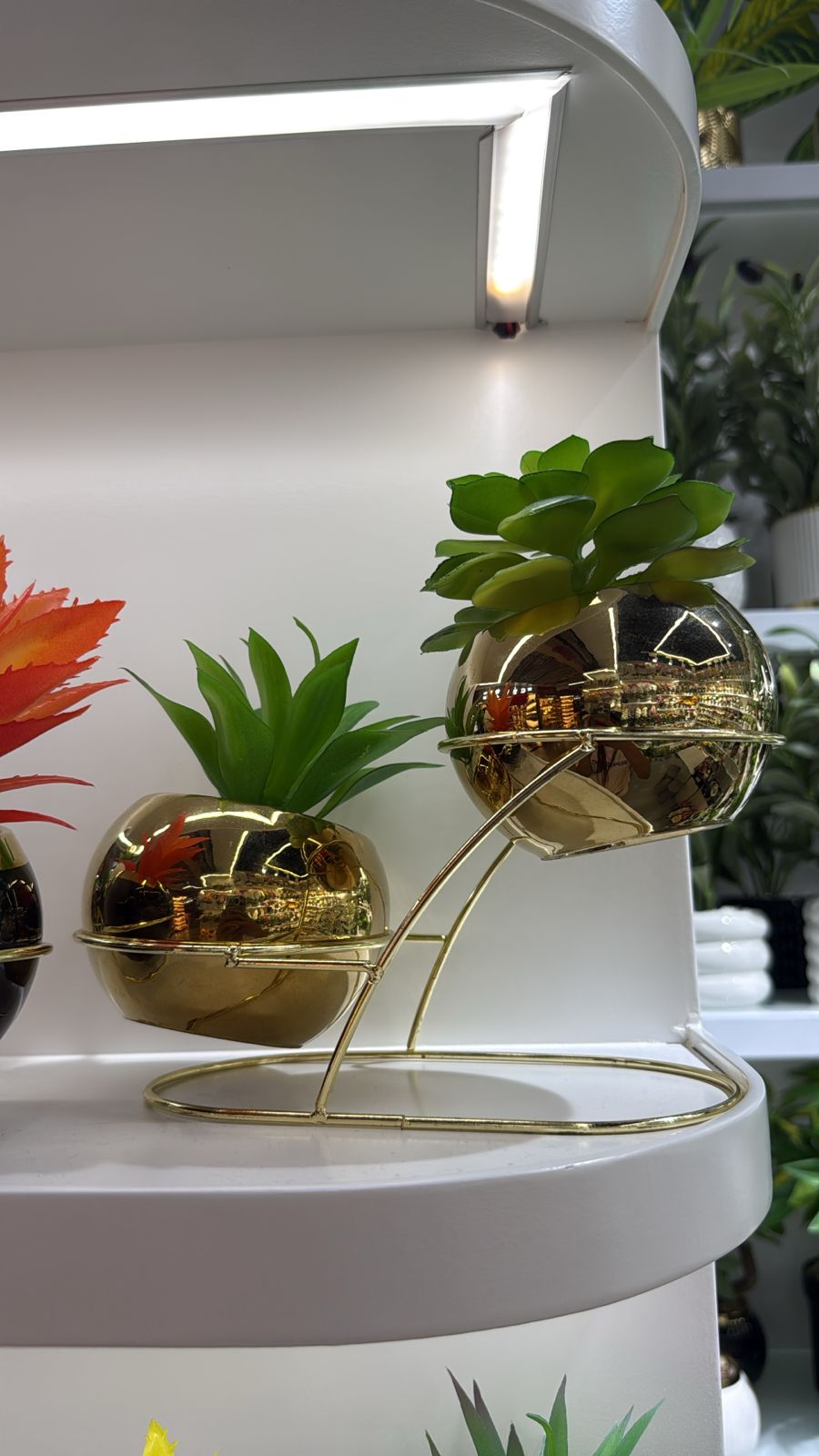 Add instant sophistication to your home or office with this stunning twin-piece decorative set. Featuring two lush artificial plants nestled in gleaming, spherical gold vases, this arrangement is elevated by a sleek, curved metal stand that creates a dynamic, tiered display. Whether placed on a console, shelf, or side table, it brings a touch of modern glam to any interior.